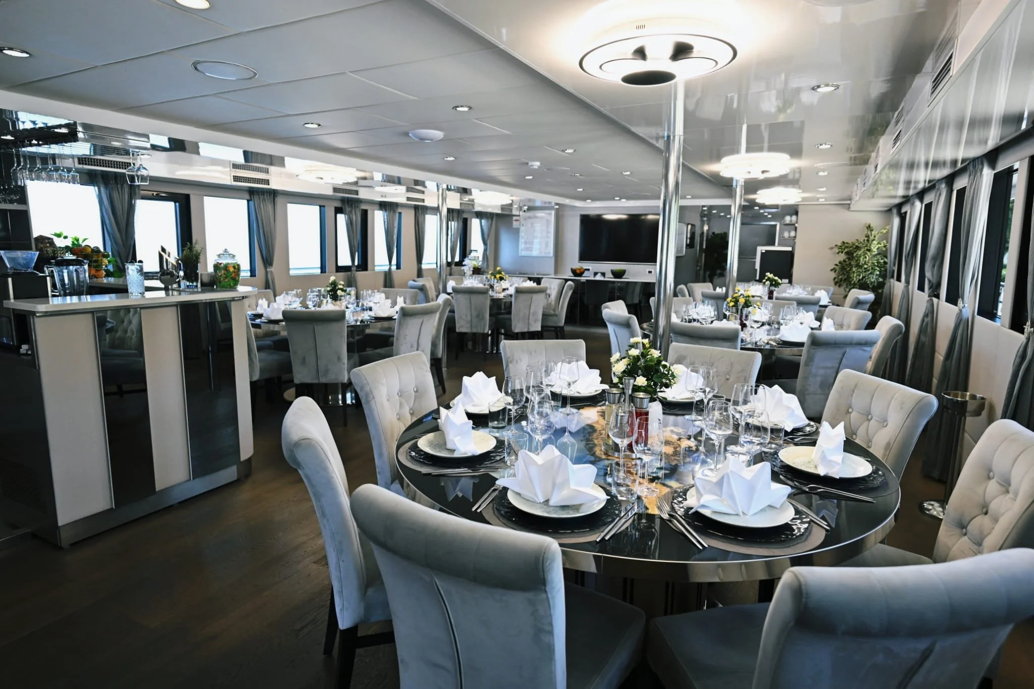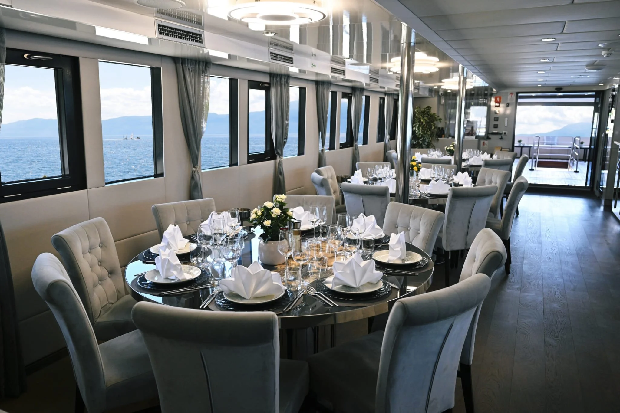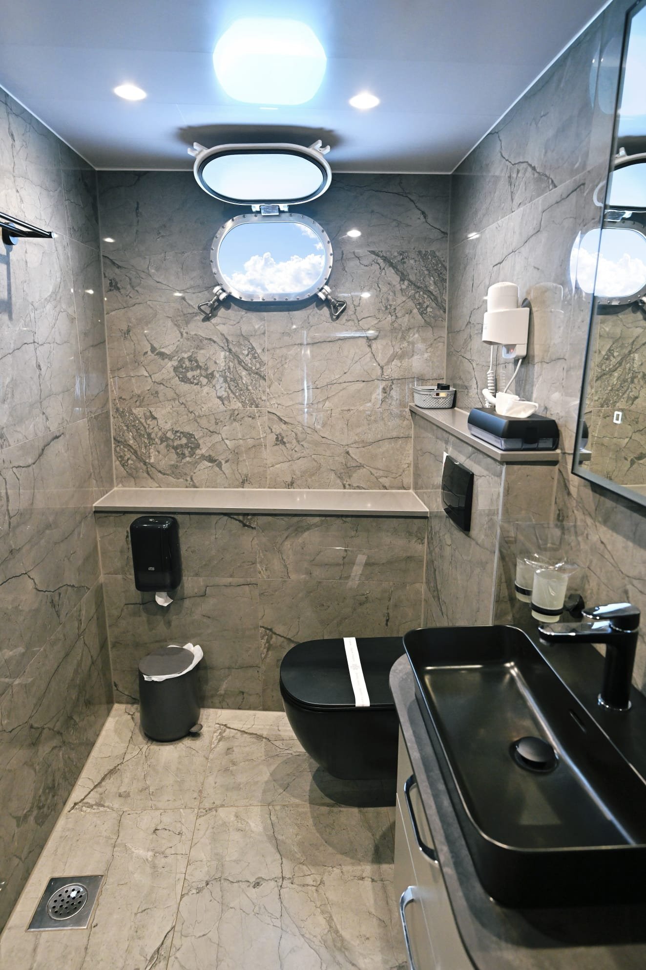 19 well-appointed and air-conditioned cabins with private bathrooms that comfortably accommodate 38 guests